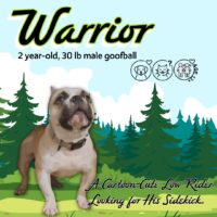 Search for dogs by their Gender, Color, Behavior, Special Needs, Age, State, Litter or a mix of these. Select Gender Male Female Select Color ApricotBeigeBlackBlueBrownBuffChestnutChocolateCreamFawnGreyGoldLiverOrangeRedRubyRustSilverTanWheatenWhiteYellowBlack and TanBlack and WhiteBlue and TanBlue and WhiteBrown and TanBrown and WhiteBuff and WhiteChocolate and TanChocolate and WhiteLiver and TanRed and WhiteSilver and CreamWhite and CreamBlenheimBrindleFlecked Ticked or SpottedHarlequinHairlessMerle-BlueMerle-RedParticolorRoanSableSaddle or BlanketTri ColorTuxedo Good With Other Dogs? I Like All Dogs I Only Like Small Dogs I Only Like Big Dogs I Like Select Dogs Big Dogs Scare Me I Don't Like Dogs I Like Female Dogs I Like Male Dogs I Have Not Been Tested with Dogs Special Needs Yes No Select Age Range Baby ( 0 - 5 Months ) Puppy ( 6 - 24 Months ) Youth ( 25 - 60 Months ) Adult ( 61 - 108 Months ) Senior ( 109+ Months ) Good With Kids? I Like All Kids I Like Kids Over 6 I Like Kids Over 10 Kids Scare Me I Don't Like Kids I Have Not Been Tested with Kids Good With Cats? I Like All Cats I Like Some Cats Cats Scare Me I Don't Like Cats I Have Not Been Tested with Cats Select State Australian Capital TerritoryAlbertaAguascalientesAucklandChungcheongbuk-doNew South WalesBritish ColumbiaBaja CaliforniaCanterburyChungcheongnam-doNorthern TerritoryManitobaBaja California SurAlabamaNelsonGangwon StateQueenslandNewfoundland and LabradorChihuahuaAlaskaNew PlymouthGyeonggi-doSouth AustraliaNew BrunswickColimaArizonaOtagoGyeongsangbuk-doTasmaniaNorthwest TerritoriesCampecheArkansasWellingtonGyeongsangnam-doVictoriaNova ScotiaCoahuilaCaliforniaJeollabuk-doWestern AustraliaNunavutChiapasColoradoJeollanam-doOntarioFederal DistrictConnecticutJeju SpecialPrince Edward IslandDurangoDelawareQuebecGuerreroDistrict of ColumbiaSaskatchewanGuanajuatoFloridaYukonHidalgoGeorgiaJaliscoHawaiiMéxico StateIdahoMichoacánIllinoisMorelosIndianaNayaritIowaNuevo LeónKansasOaxacaKentuckyPueblaLouisianaQuerétaroMaineQuintana RooMarylandSinaloaMassachusettsSan Luis PotosíMichiganSonoraMinnesotaTabascoMississippiTlaxcalaMissouriTamaulipasMontanaVeracruzNebraskaYucatánNevadaZacatecasNew HampshireNew JerseyNew MexicoNew YorkNorth CarolinaNorth DakotaOhioOklahomaOregonPennsylvaniaRhode IslandSouth CarolinaSouth DakotaTennesseeTexasUtahVermontVirginiaWashingtonWest VirginiaWisconsinWyoming Select by Litter Name Clear Filters Warrior Warrior is a bundle of energy, fun and personality with the cutest piggy tail and the biggest, most expressive eyes. Bulldog Male 2 Years Old ← Previous