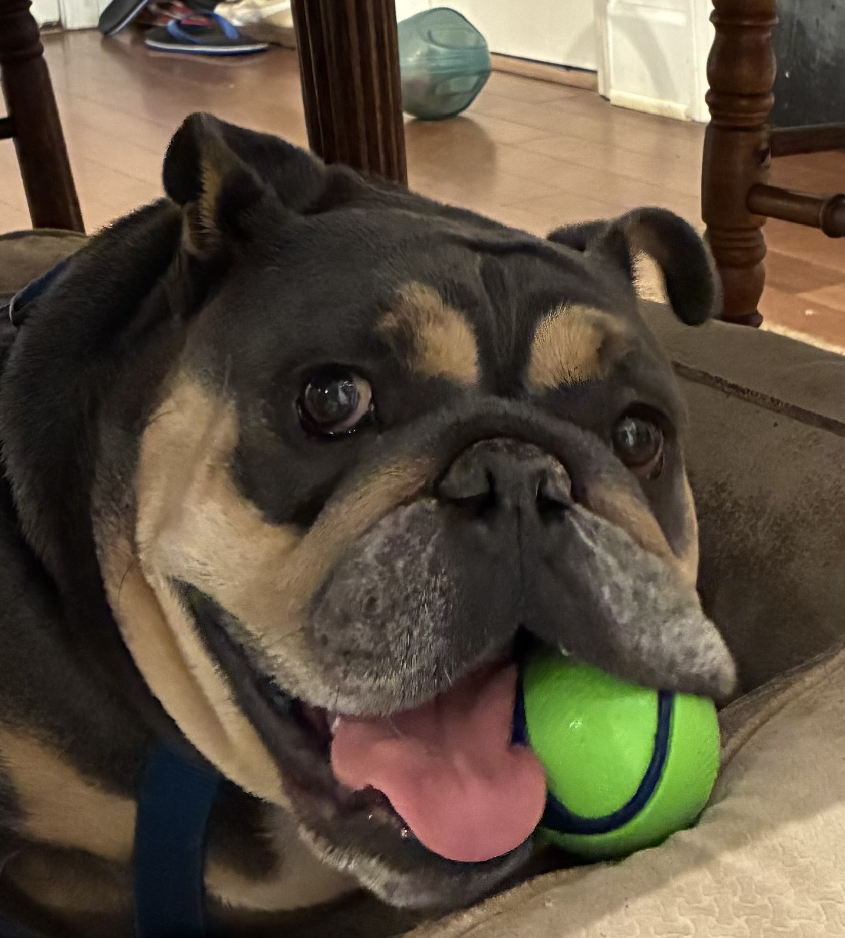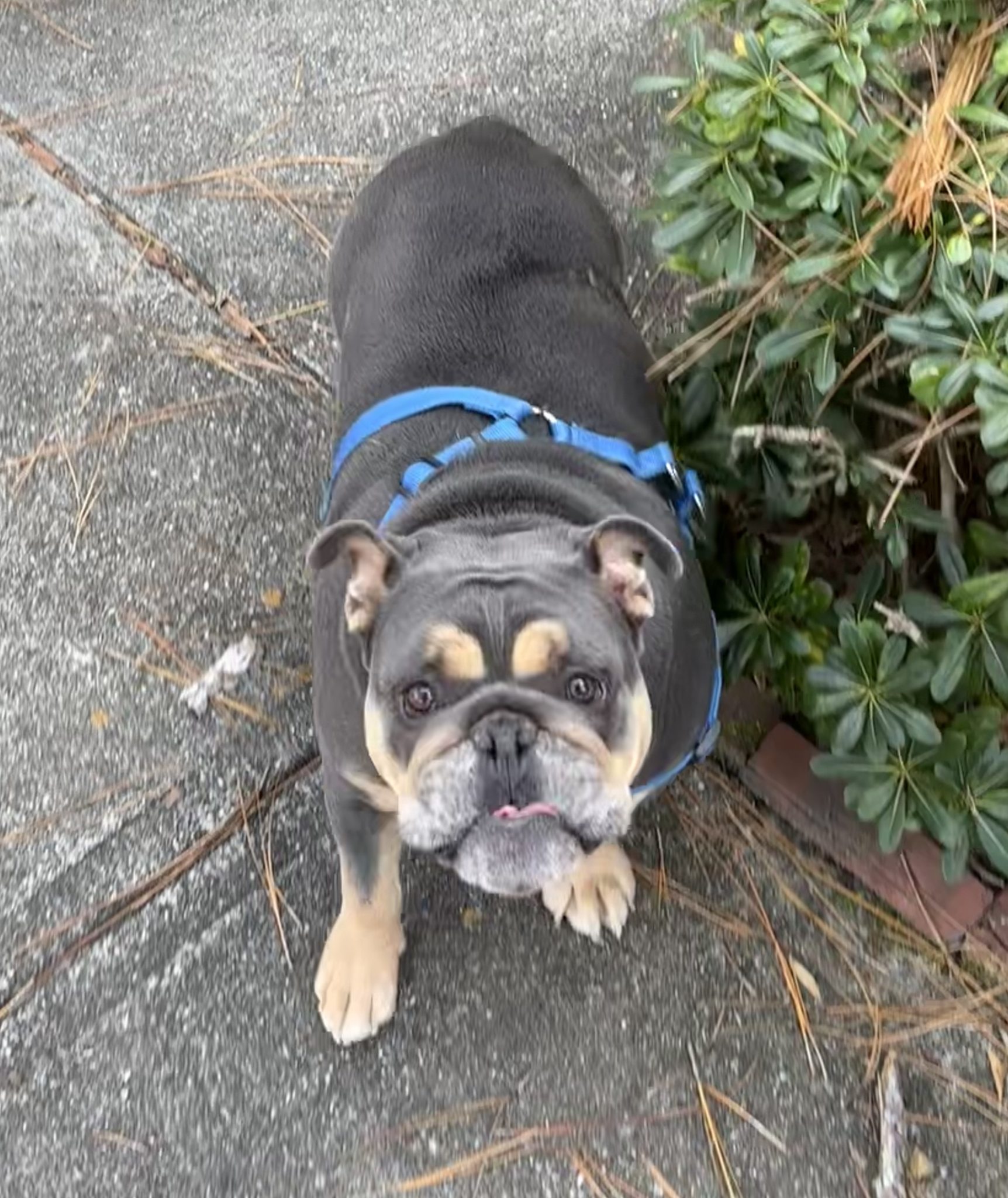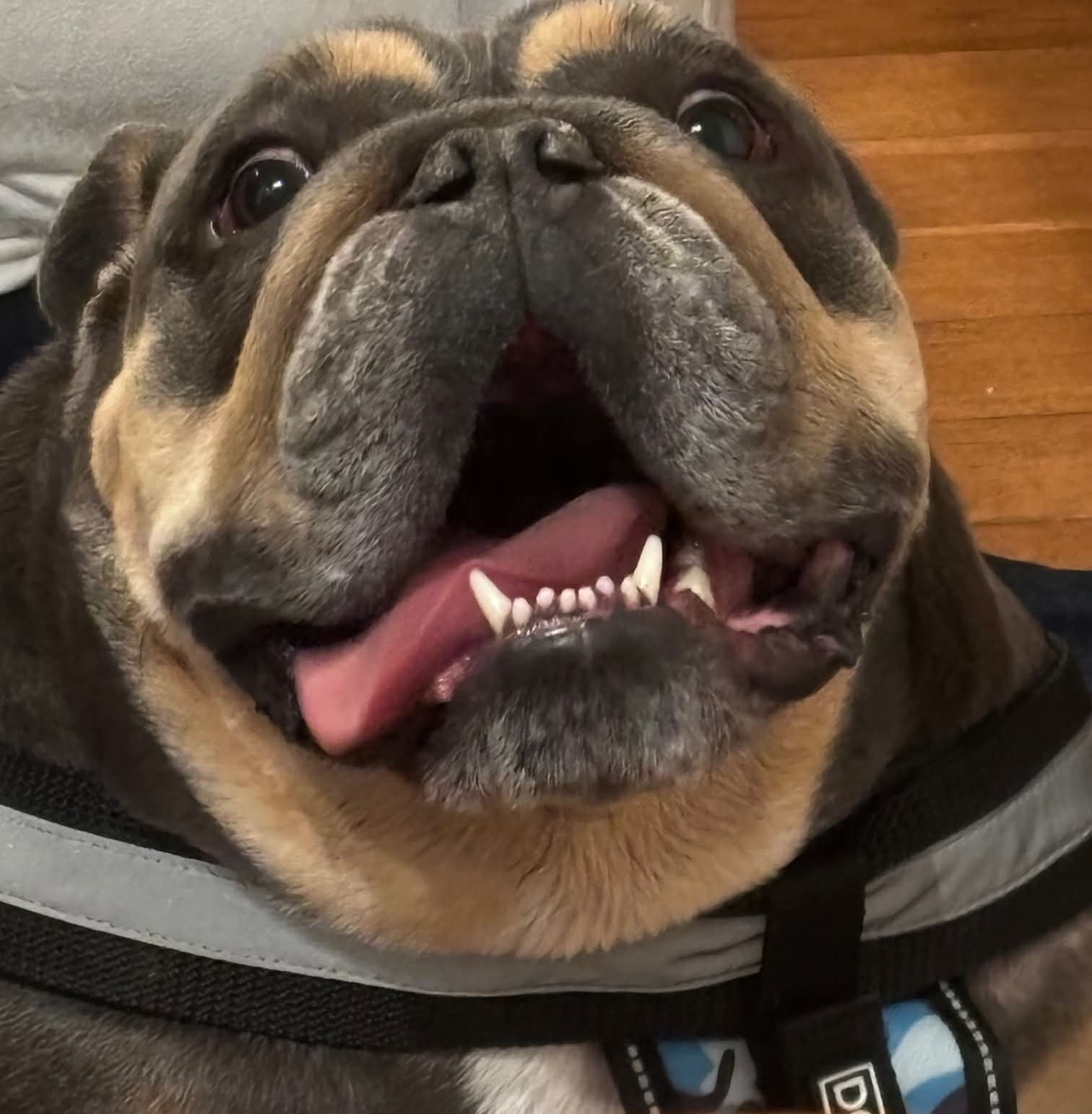 He may have mild separation anxiety and does best with people nearby, making him an ideal companion for someone who’s home often or wants a devoted sidekick. Bulldog experience is a plus, especially for tail pocket and nose rope care.