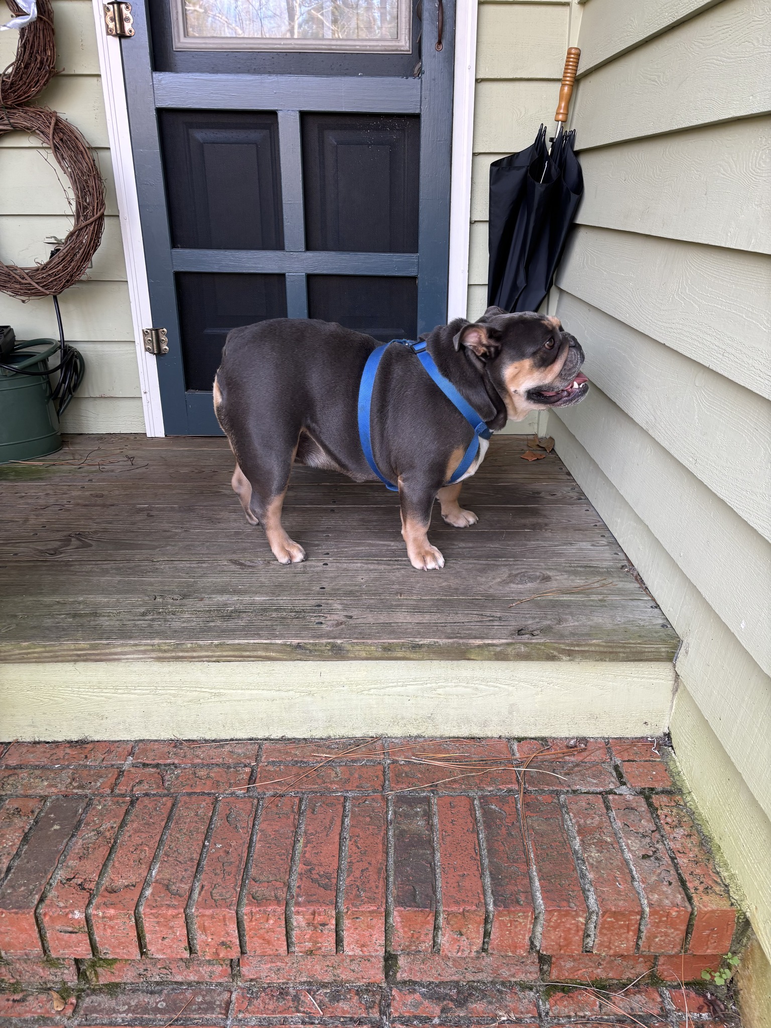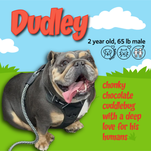 Dudley is a 2-year-old, ~65-pound chocolate bulldog with tan eyebrows, a wiggly butt, and a heart that belongs entirely to his people. His mantra? “I hope they come back soon!”—because this boy truly loves human companionship.