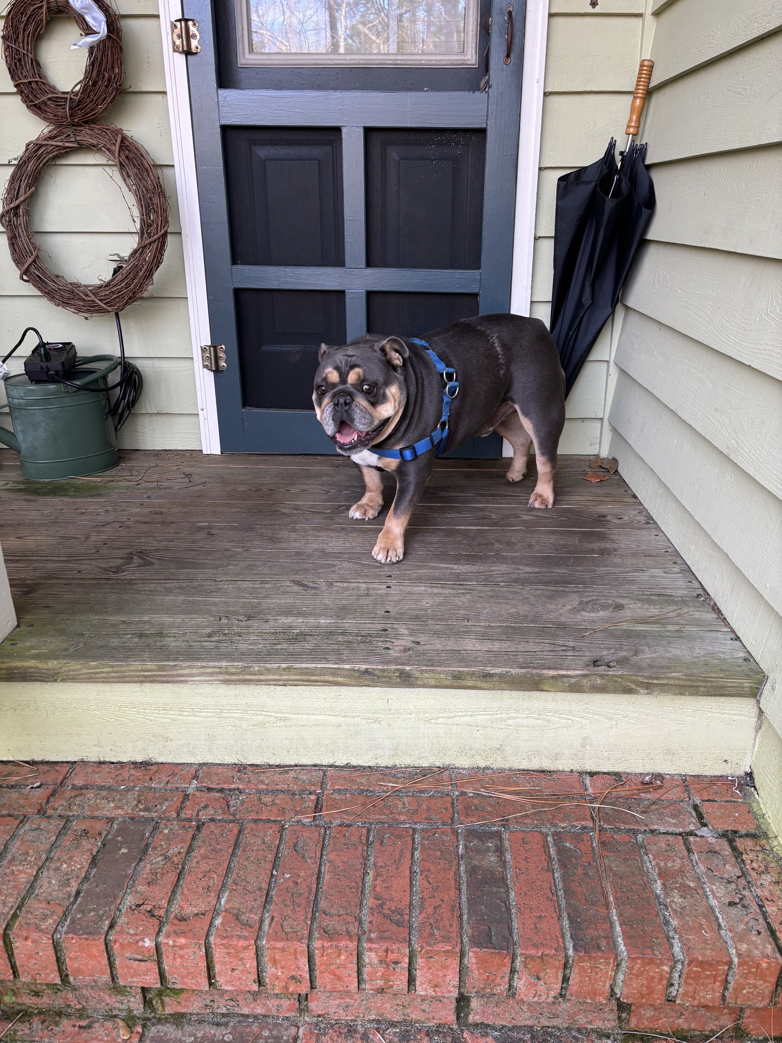 Dudley is house-trained (yes, he rings a bell!), walks beautifully on leash, rides great in the car, and has solid manners overall. He enjoys fetch, tug-of-war, lounging, and snoring like a true bulldog professional. His energy level is medium—up for playtime, but equally committed to relaxation.