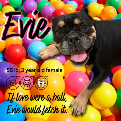 Meet Evie Bell— a 3-year-old, 55-lb bulldog with the cutest underbite, the waggiest tail, and a lifelong commitment to loving people.