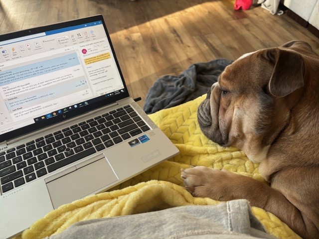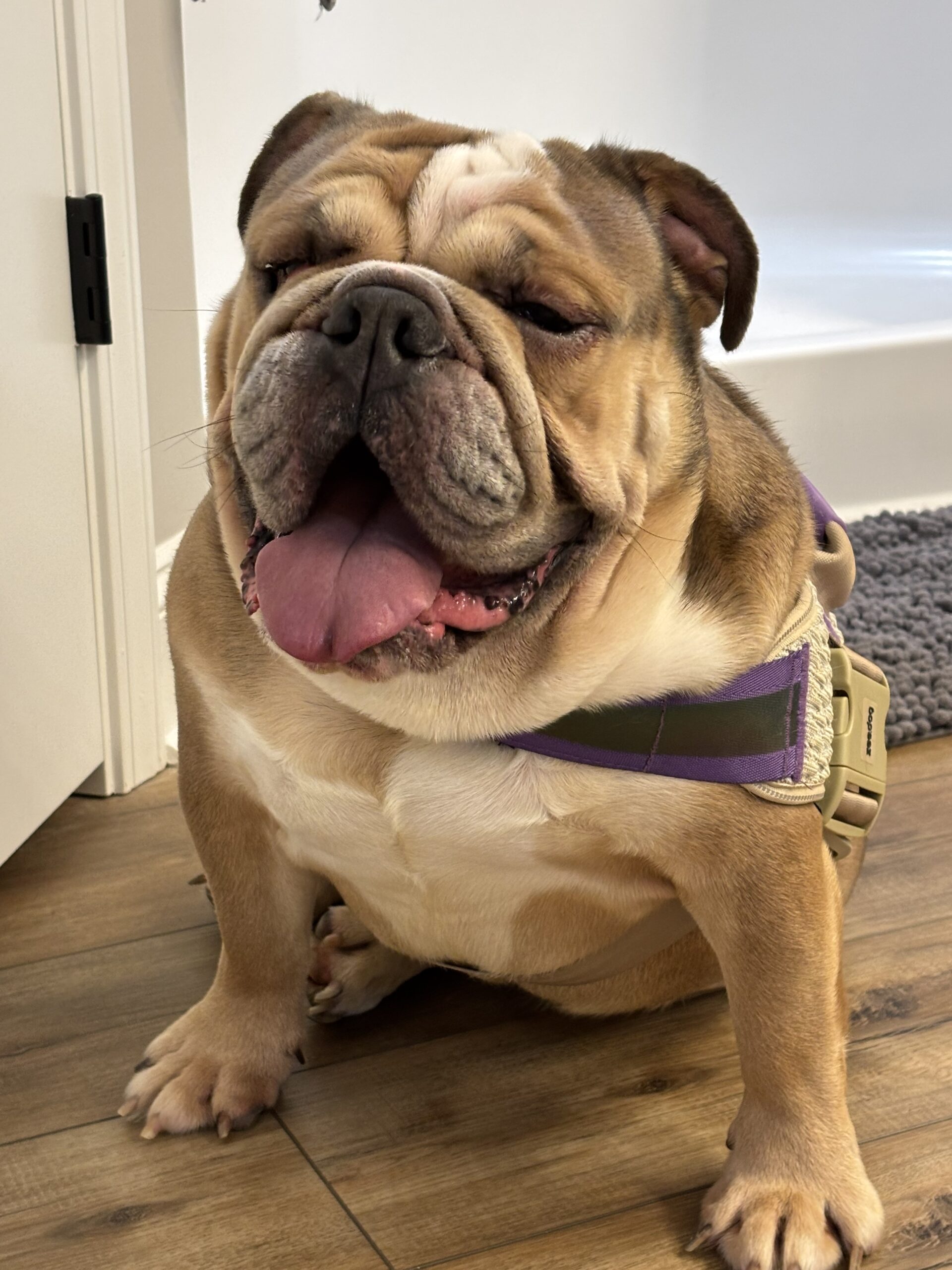 Luke loves being outside sniffing and trotting around and would do best with a fenced yard. Fair warning: if he decides outside time isn’t over, he will channel peak bully stubbornness and politely refuse to come in. He walks beautifully on leash, is food-motivated, crate trained, and working hard on potty training (currently sporting fashionable disposable wraps).