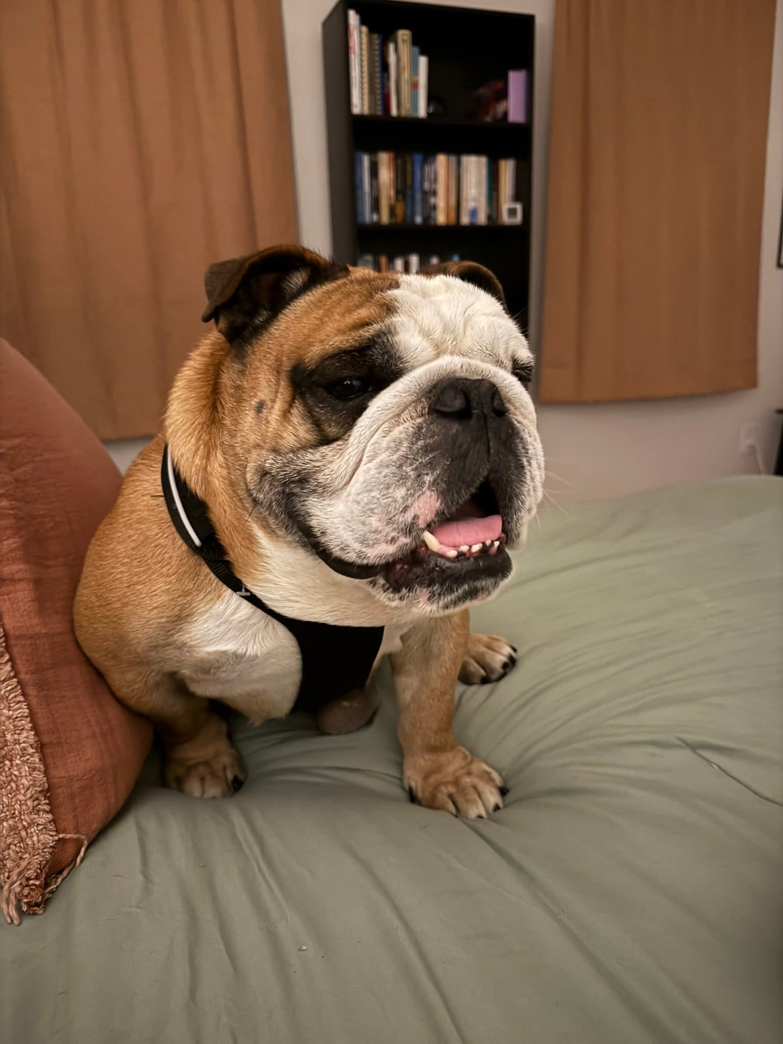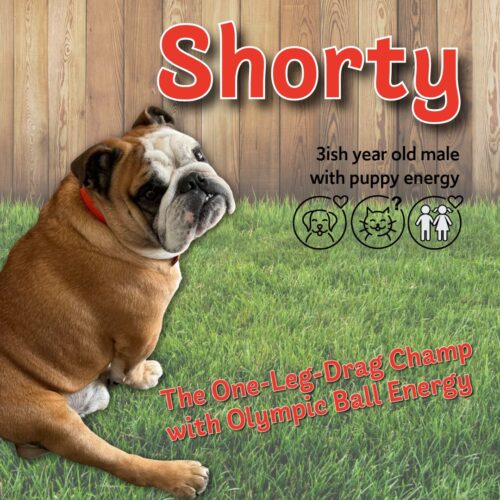 Shorty is a 3–4-year-old bulldog with big puppy energy, a hilarious ball obsession, and the cutest little peg-leg swagger you’ve ever seen. Life didn’t start out easy for him — he spent years isolated after a family baby developed allergies — but now he’s making up for lost time with wiggles, learning, and LOTS of fetch practice.
